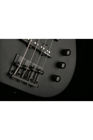 A Jackson P style neck pickup and Jackson J style bridge pickup power this 4-string bass, which also features a pair of volume knobs, single tone knob, hardtail bridge with black base plate and Jackson-branded tuners.