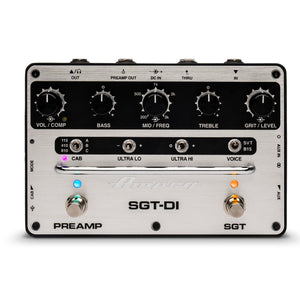 The SGT-DI preamp and DI gives modern bassists an entire rig in a single stompbox. It delivers an enhanced Super Grit Technology overdrive circuit featuring iconic Ampeg SVT® and B15 voices, versatile 3-band EQ now with sweepable Mid circuit, Ultra-Hi and 3-way Ultra-Lo switches, a variable compressor, and an Aux /Headphone section. Plus! Introducing the first IR Loader/Cab Simulator from Ampeg. Choose from three classic factory cabs or up to three cabs of your own by using the free Ampeg IR Loader application.