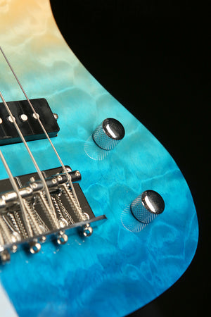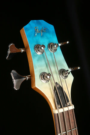 Bass ukulele, electric ukulele, metal strings, solid body, comfort styling, gradient transparent blue finish, mahogany body, roasted maple neck, and inlay position markers, side position markers, closed geared bass tuners, Alnico 5 P-Style pickups, chrome volume control, chrome tone control, hardtail fixed bridge.