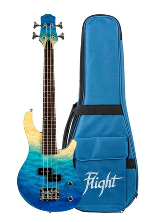 It is time to lay down some awesome grooves with Flight's Mini Bass Electric Ukulele! The Mini Bass is Flight's second bass ukulele, its first with a solid body and metal strings. This incredible instrument features standard bass tuning (EADG) in a smaller 510mm/20" scale that is perfect for gigging and traveling bass players. With a gradient blue finish on a quilted maple top, modern styled body, roasted maple neck, and rosewood fretboard, the instrument has been created to look awesome and be comfortable to play. With Alnico 5 P-Style pickups, the TBL Mini Bass offers a clear, sweet tone, depending on what effect pedals and amplifiers you choose to pair with it. As with all Flight ukuleles, you'll find that the TBL Mini Bass Ukulele offers great quality at an affordable price. Stay out of treble, and catch one of these great instruments at a Flight dealer today!