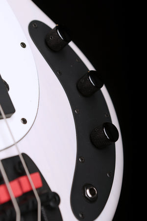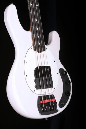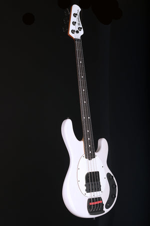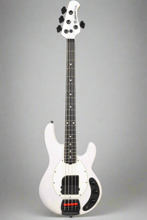 fretboard, this StingRay delivers a bold, balanced tone. The passive version, offered in Fight Night White, delivers raw punch and dynamic feel. Both versions include Tim’s custom height- adjustable finger ramp, a string-through-body bridge with red mute pads, and black hardware for a sleek, road-ready look.
