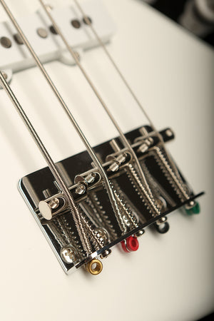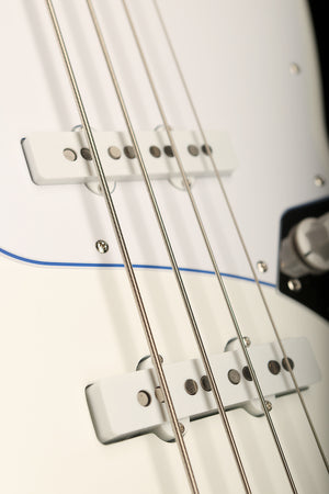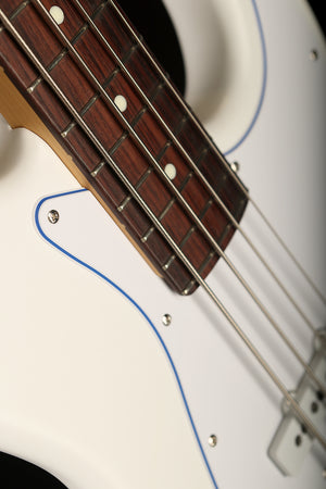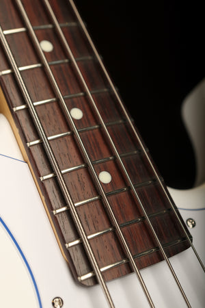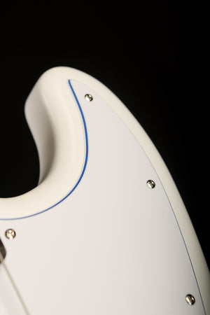 The white satin body is paired with a 3-ply white pickguard featuring a striking blue centre layer, while a matching blue metal logo on the headstock adds a subtle pop of colour. With the pickguard and knob set finished in white, it gives the whole bass a sleek, unified look.