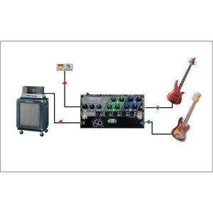 The Bassbone OD is a bass preamp with two instrument input channels, each of which is fully equipped with a level control, super powerful passive-interactive EQ and a low frequency filter to help eliminate resonance. Channel-A is equipped with a PZB booster switch that increases the sensitivity and load to 10 meg ohms to optimize it for use with piezo transducers as commonly used on upright bass. Channel-B takes a different slant with Drag Control load correction to optimize the tone and feel when using a passive instrument such as a vintage Fender bass. Toggling between channels is done using a footswitch and both channels may be mixed together by depressing the blend switch, should a dual pickup system be in use. Outputs include a ¼' instrument level output to feed the artist's on-stage amplifier plus a balanced low-Z Radial DI box output to feed the PA system. The XLR output can be assigned pre or post effects to suit the engineer's preference. A separately buffered tuner output works with the mute footswitch for quiet on-stage tuning.