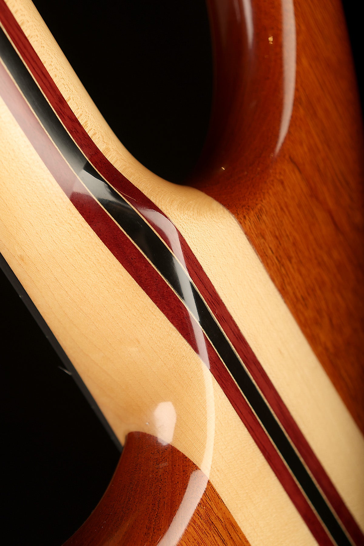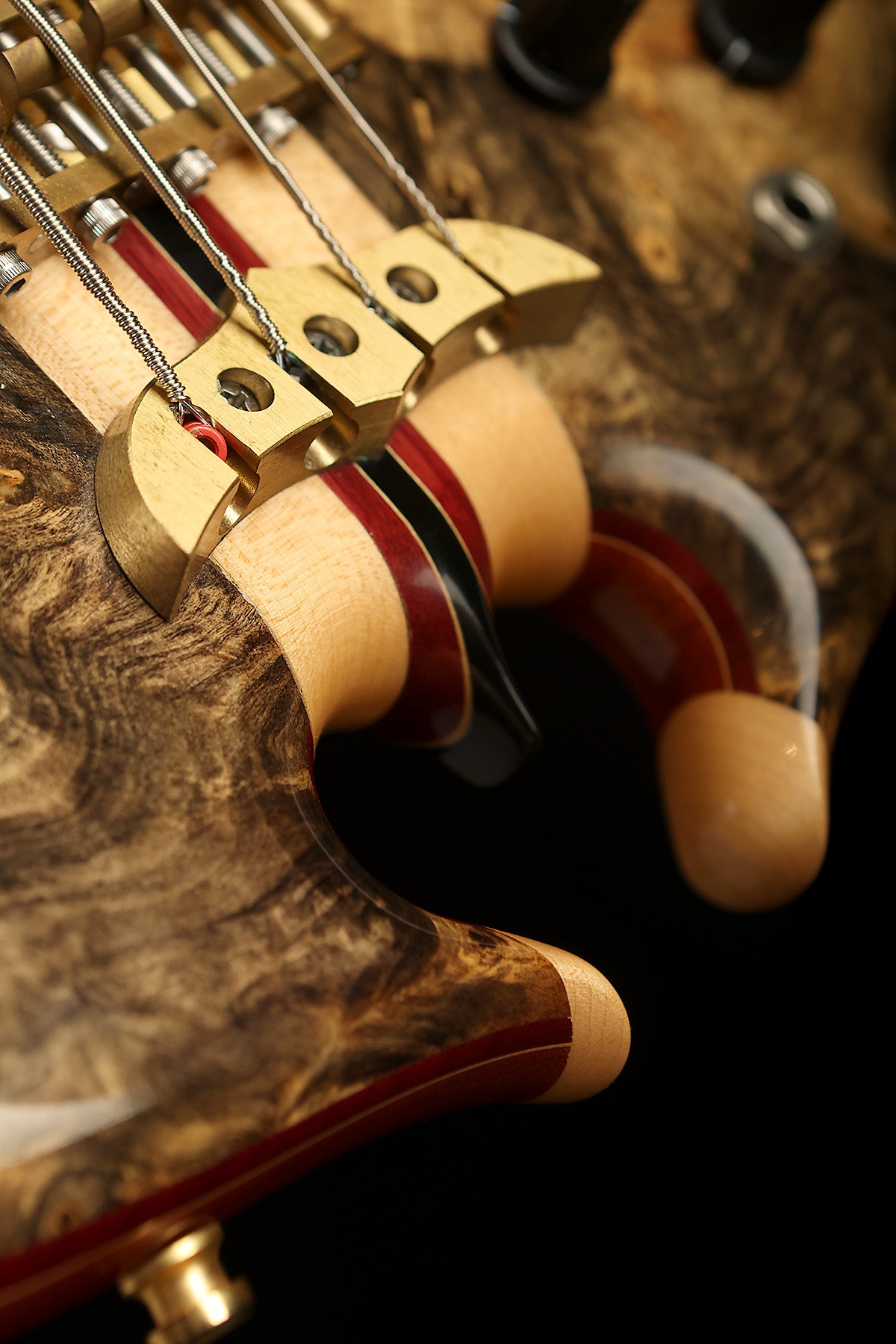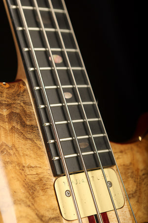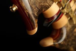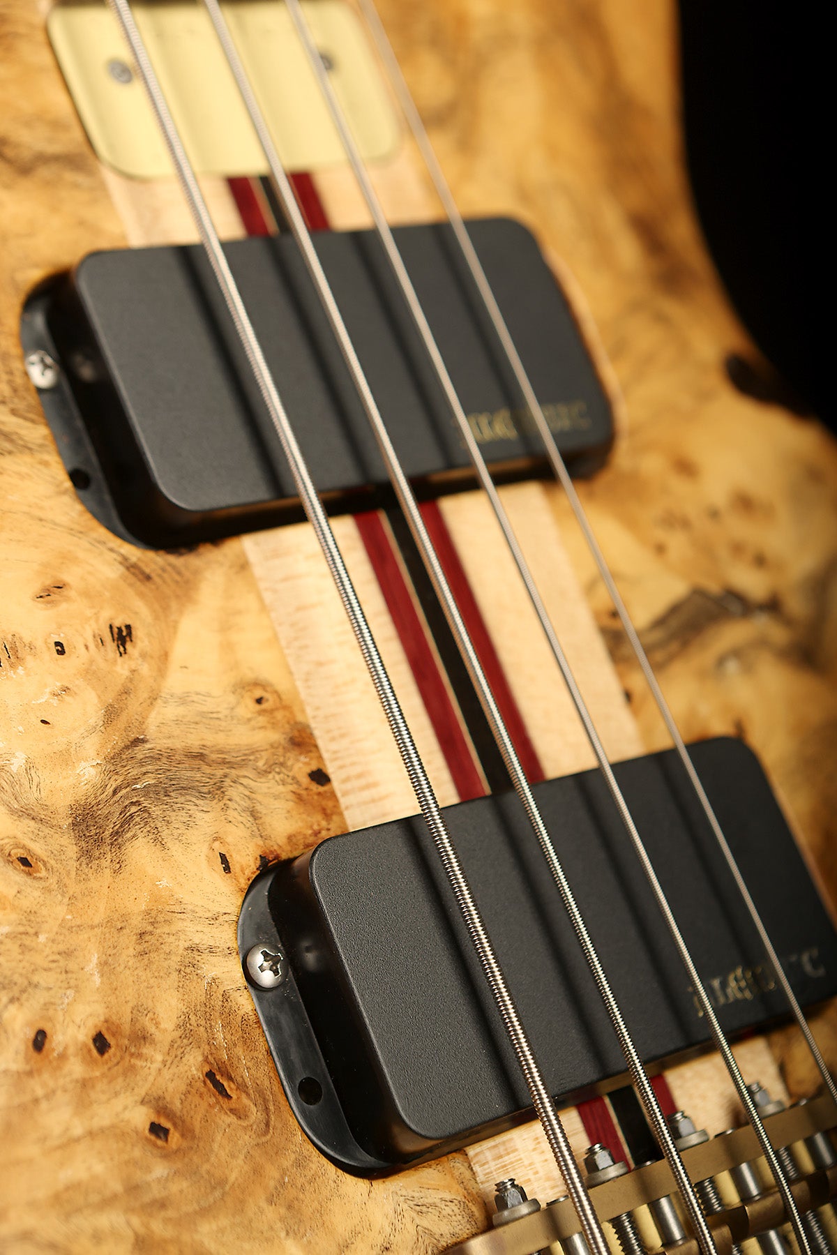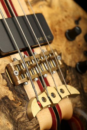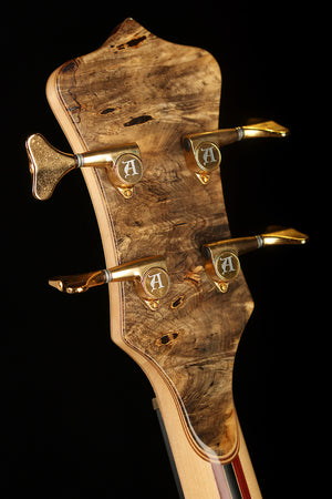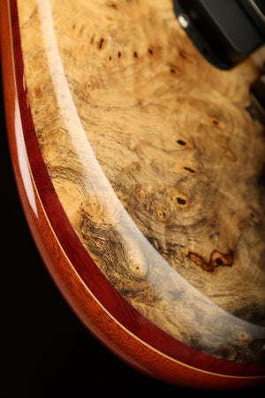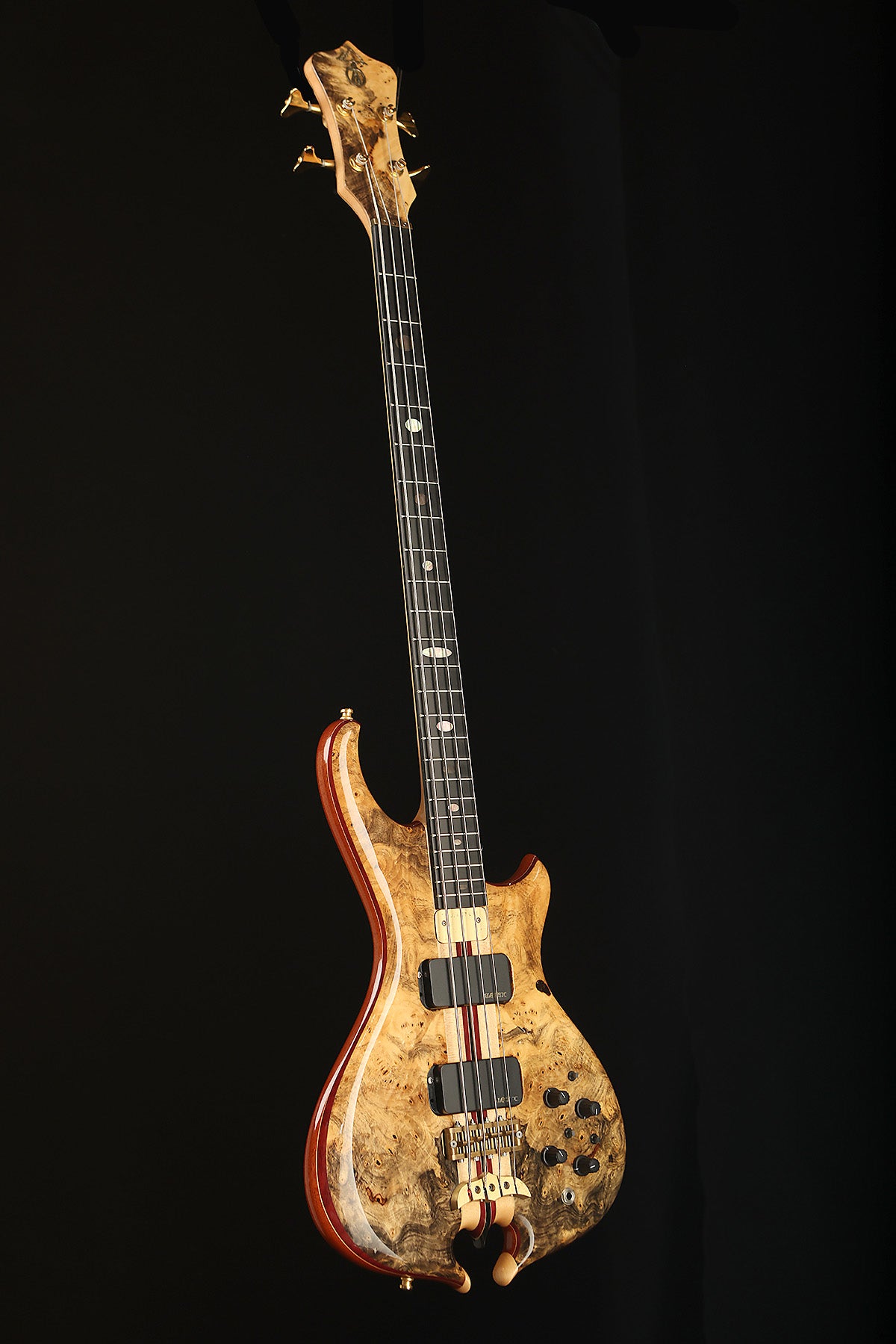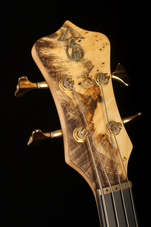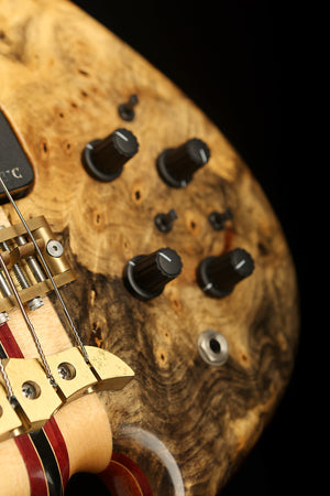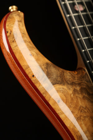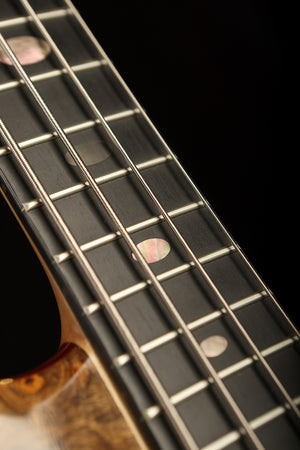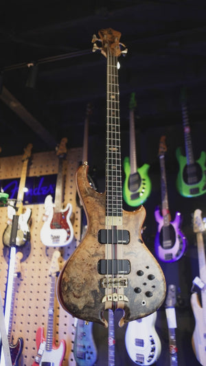 This bass was custom built for a customer of ours with no expence spared. A magnificent Buckeye burl top, maple/purple heart multi laminated neck thru construction, Ebony fretboard with mother of pearl inlays, LED's on the neck, Alembic pickups and active preamp, Solid Brass bridge. It is seriously a work of art!