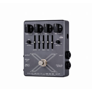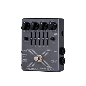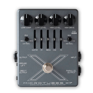 Distorting bass has always been a very challenging engineering endeavor: in order to achieve a punchy, and aggressive distortion that is also full and fat-sounding you need to reconcile two contradicting conditions: The tightness comes from attenuating bass frequencies before saturation, which will also result in a very thin signal. But boosting the lows will result in additional, unwanted fuzz. To solve this paradox, audio engineers have been using multiband distortions in the studio for a few decades now. The Microtubes X7 is our solution to that problem in a very compact, yet flexible form: The signal is split by two variable low pass and high pass filters at the very very beginning. The high pass signal (mostly mids and treble) is distorted with a CMOS chip, just like our older Microtubes pedals. The low-pass signal (all bass) is left clean and then compressed. Letting the high side be all crunch, attack, and rich harmonics while mixing back the compressed lows to add gargantuan size to the overall mix. The result is some remarkable, almost unlimited fullness, size, aggression, and definition, regardless of how old the strings, and boomy or thin instruments. The Microtubes X7 offers all of this plus a 4-band graphic equalizer with perfectly tailored mid controls for maximum flexibility, with unbalanced parallel, affected and direct outputs