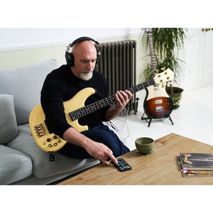The advanced ambience setups in Waza-Air Bass provide three realistic environments to play in. Surround mode places the amp in a virtual room, providing an immersive experience like playing in a recording studio. Things get even more realistic with Static mode, where the combined amp and room sound changes depending on where you move your head. Stage mode lets you step into the spotlight, with the amp sound coming from a virtual backline behind you, along with the onboard acoustic drum patterns or music streamed from your phone over Bluetooth.