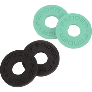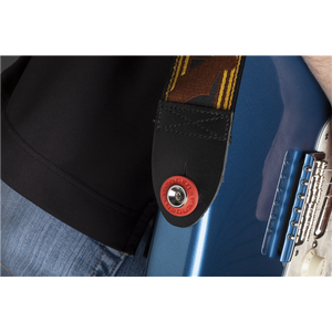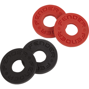 Set of four Fender Strap Blocks (two black and two red) that provide a remarkably simple and effective means of "locking" instrument straps in place.