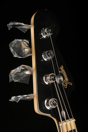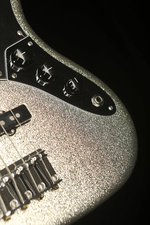 Featuring an alder body finished in dazzling silver sparkle and a sleek maple neck with black binding, block inlays and gloss black painted headstock, this bass is sure to turn heads. Boasting more than show-stopping looks, the Mikey Way Jazz Bass is built for maximum punch and versatility. A powerful pair of vintage-style ’70s single-coil Jazz Bass pickups deliver the classic sound that defined an epic era of rock. The ’70s “C”-shaped maple neck is comfortable and easy to maneuver for speedy riffs and high-octane gigs. Other features include a vintage-style 4-saddle bridge, ’70s style “Fender” stamped tuners, “Bullet” style truss rod nut and Mikey’s signature on the back of the headstock.