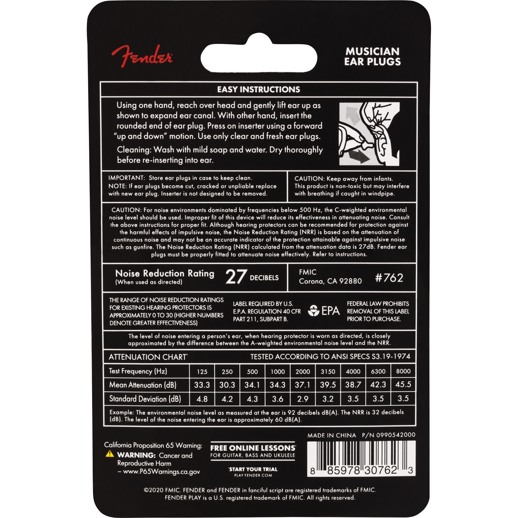 Play all night without suffering from painful morning-after tinnitus. With a 27-decibel noise reduction rating (when used properly), Fender Musicians Series earplugs provide high-volume hearing protection designed specifically for musicians - perfect for rehearsals and performances.