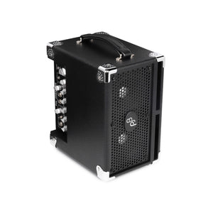 The cabinet is constructed of solidly braced Baltic birch plywood and is appointed with luxury “tolex” covering with color options of both Burgundy Red and Black. The input has a switchable gain (for active and passive basses), mute switch, and LED clip indicator which will accurately match all bass instruments. The FX Send/Return sockets feature a blend control to achieve desired balance between FX and dry signals. An auxiliary input has a level control for quick mixing of external devises such as a drum machine or iPod/MP3 player, which are audible through the stereo Headphone Socket or speakers.