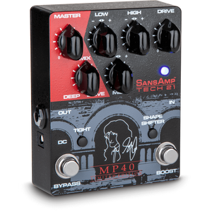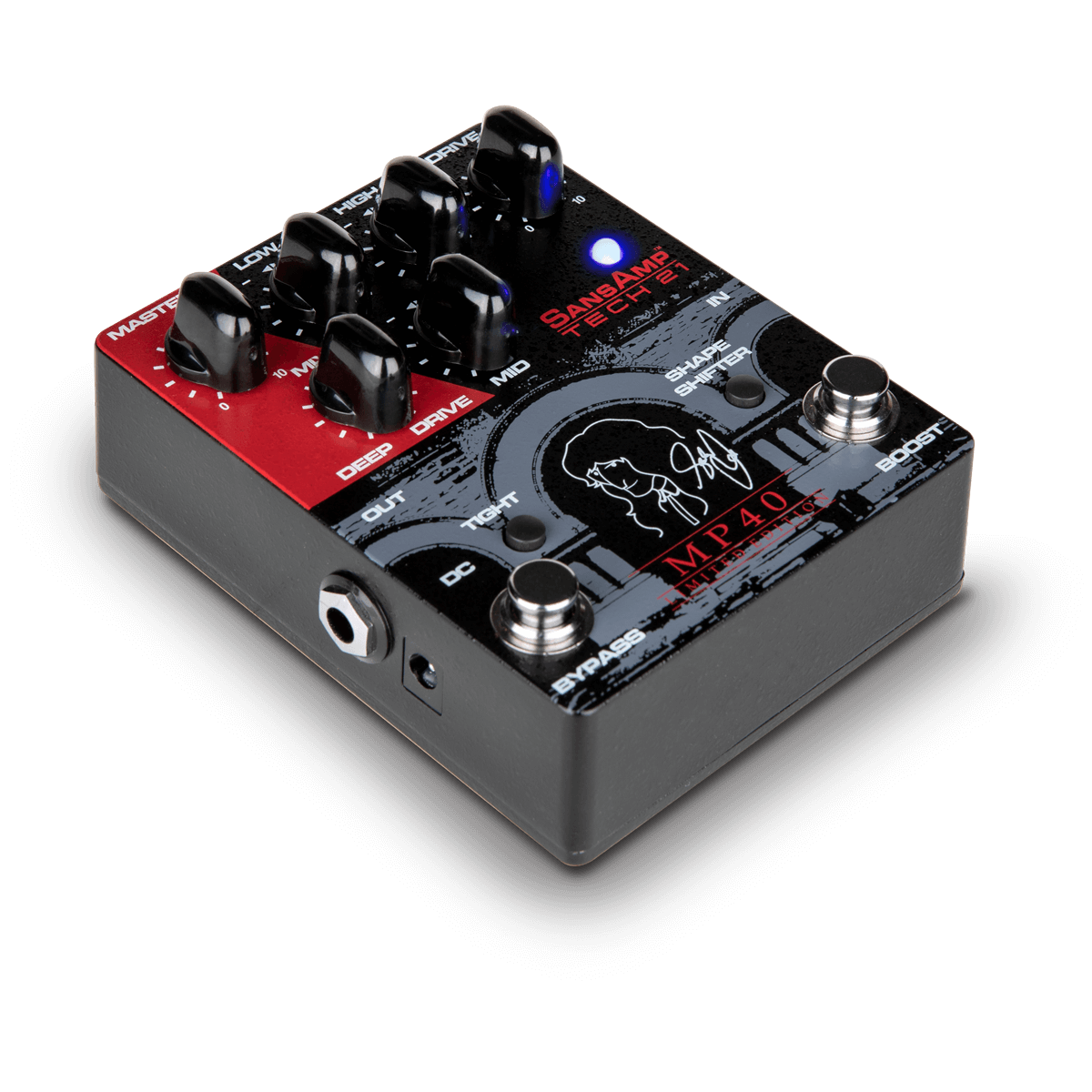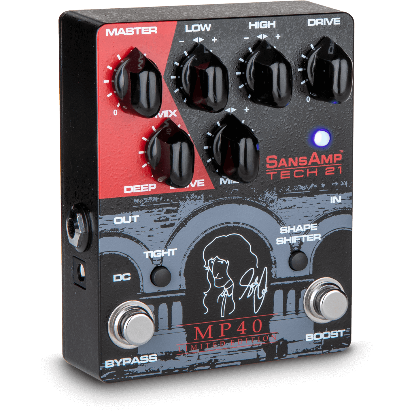 The all-analog MP40 SansAmp builds upon the original YYZ pedal with a brand new selectable Boost stomp switch that provides a 12dB presence boost for increased top-end distortion. Additionally, engaging the Shape-shifter button gives you 6dB of Schmegilka on top, which, according to Geddy, “is an indefinable thing of awesomeness!”