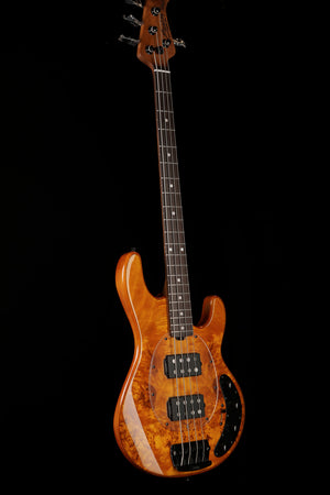 The newest StingRay Ray34HH features a roasted maple neck, rosewood fretboard, 5-way switching, and an incredible Poplar Burl Top finished in trans Amber