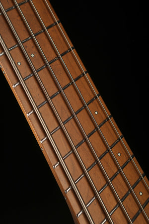 The Boden Bass Standard 5 model features a solid American Basswood body with Flame Maple veneer and quartersawn Roasted Maple neck and fretboard. This classic wood combination delivers a strong midrange from the body with brilliance and punch from the neck, resulting in a very balanced and articulate sound to cover a variety of playing styles and musical genres. The neck is reinforced with carbon fiber and Walnut for rigidity as well as long-term stability.